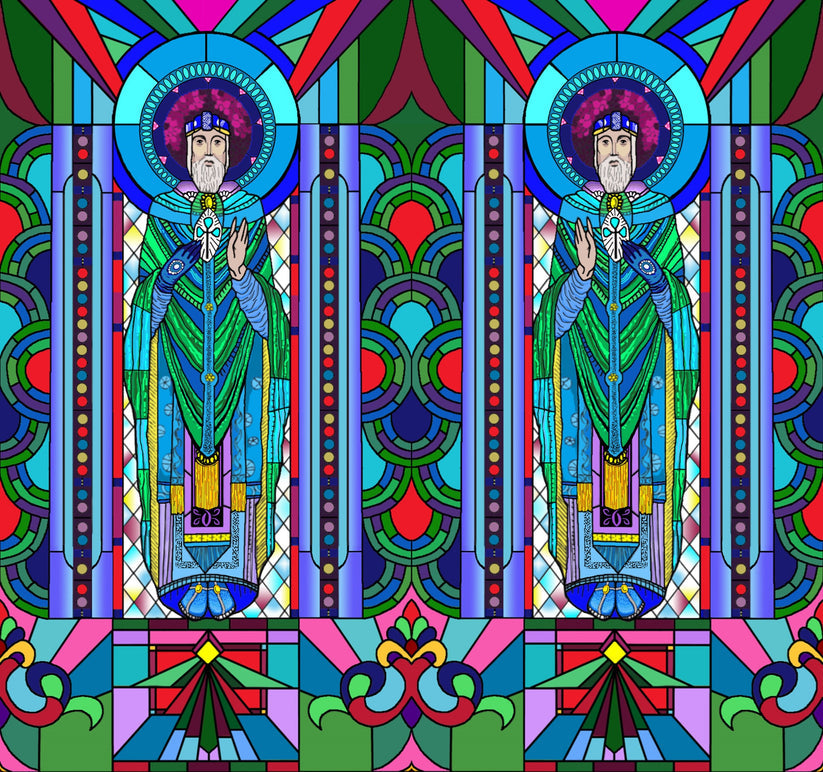 The Saint Patrick’s print is inspired by Harry Clarke’s stain glass in St. Mary’s RC Church, Ballinrobe, co. Mayo. With dazzling colour, etched and scratched effects and immense detail, diverse tones and texture are produced. Saint Patrick’s Day is observed on 17 March, the supposed date of his death. It is celebrated inside and outside Ireland as a religious and cultural holiday.