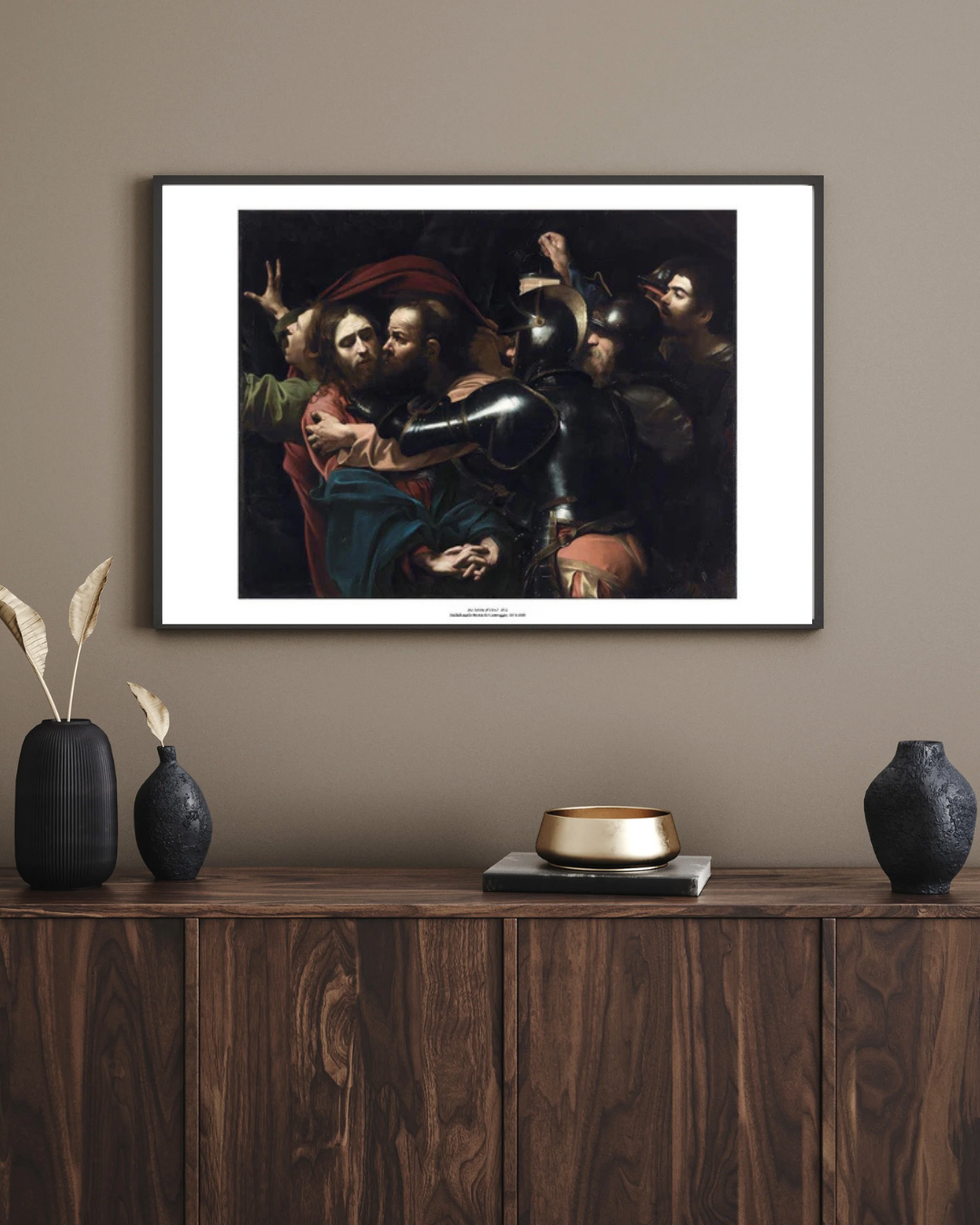 This powerful work was painted at the height of Caravaggio's fame, and the theatrical light and realistically observed figures are representative of his mature style. The drama reaches an emotional pitch as Judas kisses and identifies Christ, who does not resist his arrest by the soldiers, menacingly clad in shining black armour. The fleeing disciple on the left is St John the Evangelist, whose face is united with those of Jesus and Judas by moonlight.