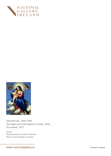 The National Gallery of Ireland's popular Christmas card range, all of which are based on images from the Gallery's collection. This 10 pack of cards contains Sassoferrato's The Virgin and Child Seated in Clouds.